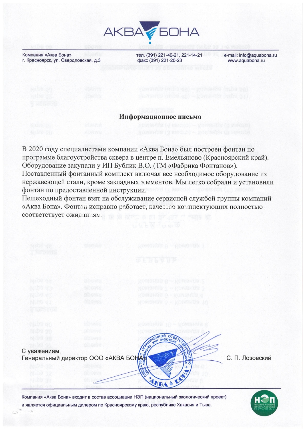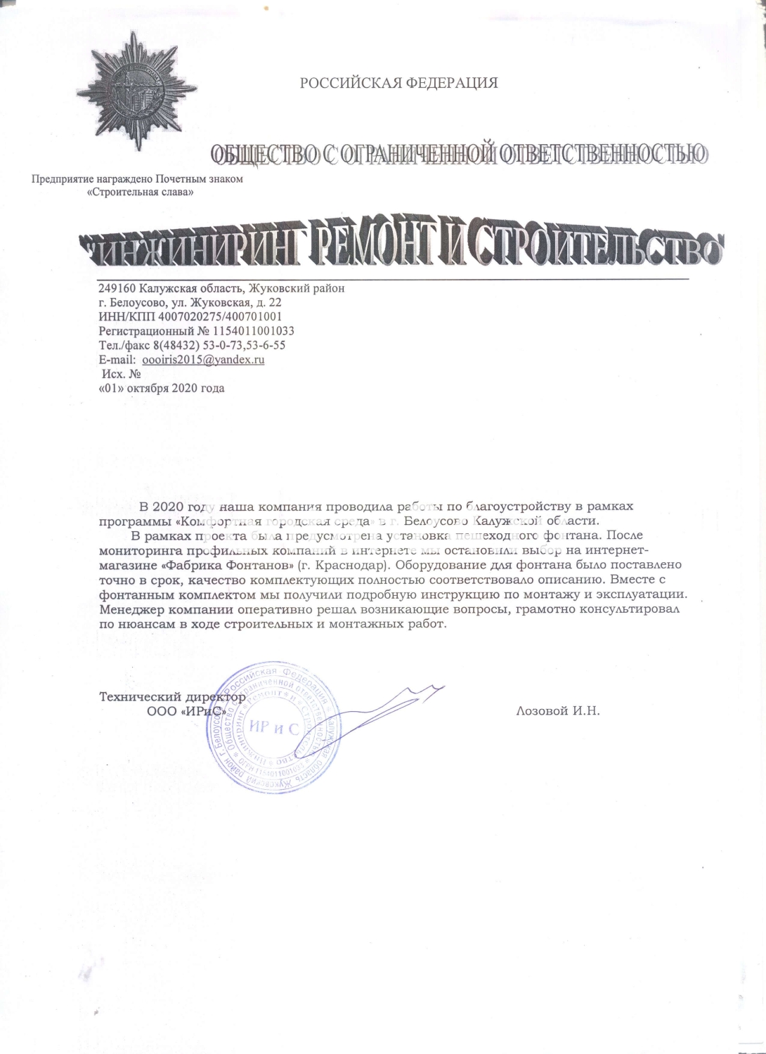 В 2020 году наша компания проводила работы по благоустройству в рамках программы «Комфортная городская среда» в г. Белоусово Калужской области. В рамках проекта была предусмотрена установка пешеходного фонтана. После мониторинга профильных компаний в интернете мы остановили выбор на интернет-магазине «Фабрика Фонтанов» (г. Краснодар). Оборудование для фонтана было поставлено точно в срок, качество комплектующих полностью соответствовало описанию. Вместе с фонтанным комплектом мы получили подробную инструкцию по монтажу и эксплуатации. Менеджер компании оперативно решал возникающие вопросы, грамотно консультировал по нюансам в ходе строительных и монтажных работ.