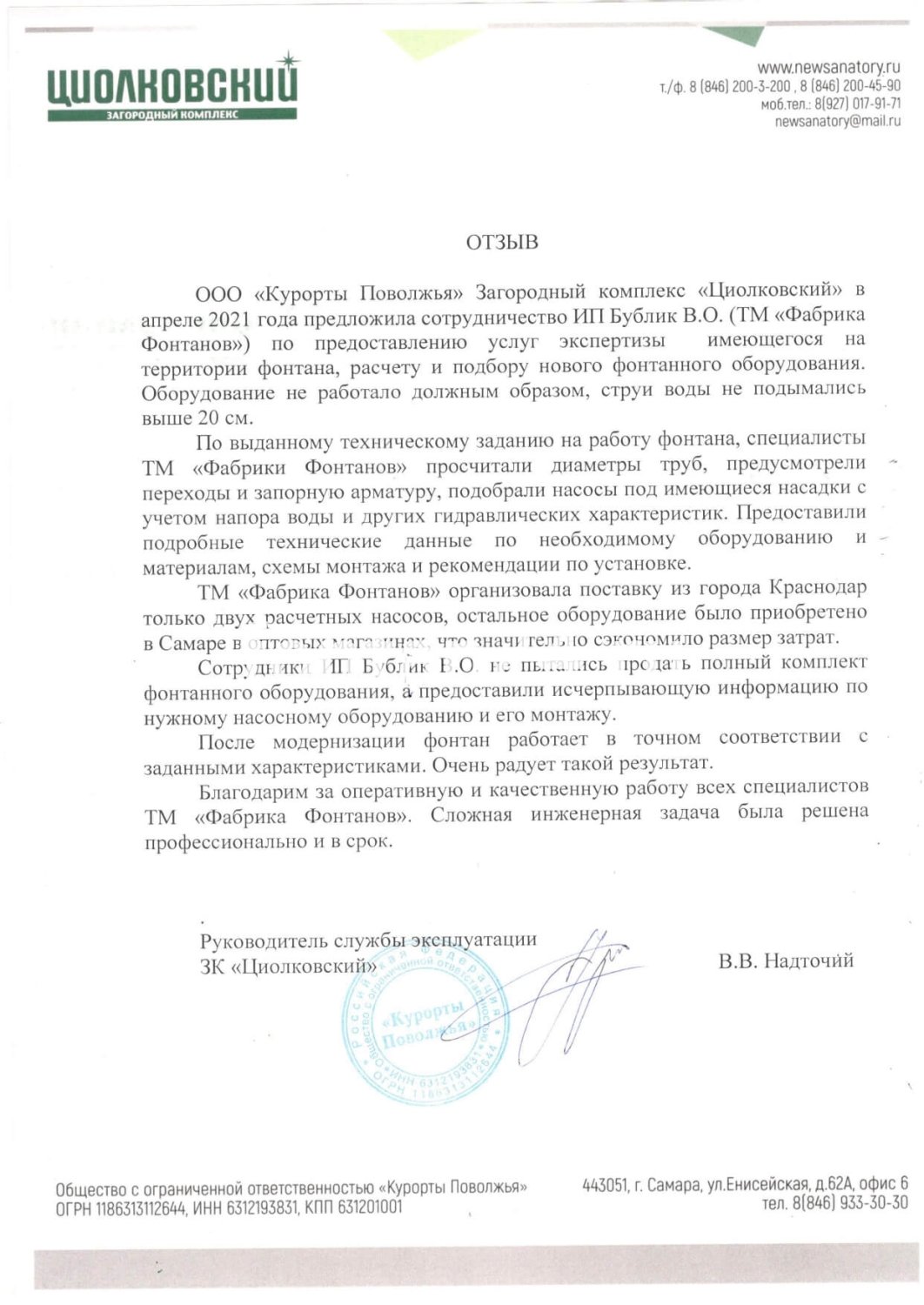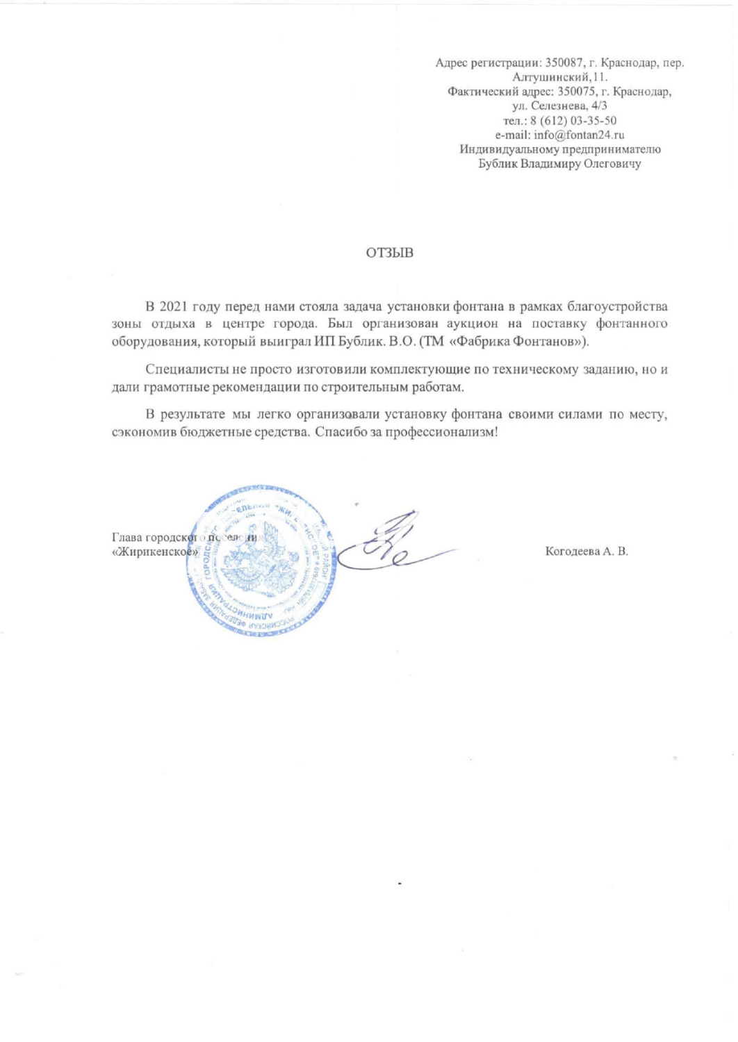 В 2021 году перед нами стояла задача установки фонтана в рамках благоустройства зоны отдыха в центре города. Был организован аукцион на поставку фонтанного оборудования, который выиграл ИП Бублик. В.О. (ТМ «Фабрика Фонтанов»). Специалисты не просто изготовили комплектующие по техзаданию, но и дали грамотные рекомендации по строительным работам. В результате мы легко организовали установку фонтана своими силами по месту, сэкономив бюджетные средства. Спасибо за профессионализм.